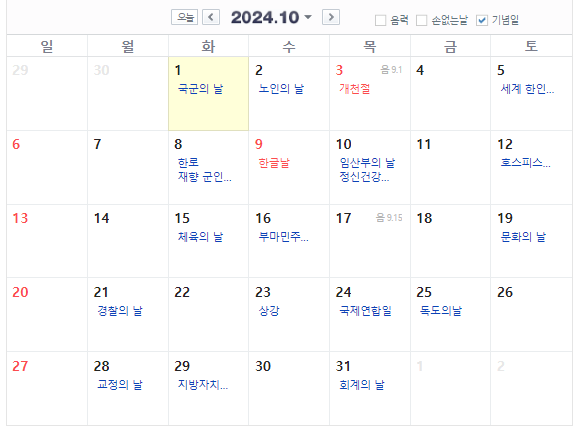 10월 달력