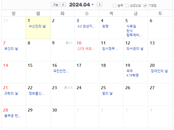 그리고 요즘 정치권이 시끌시끌 한데 드디어 총선이 있는 달이죠. 덕분에 우리는 하루의 공휴일을 얻었네요.