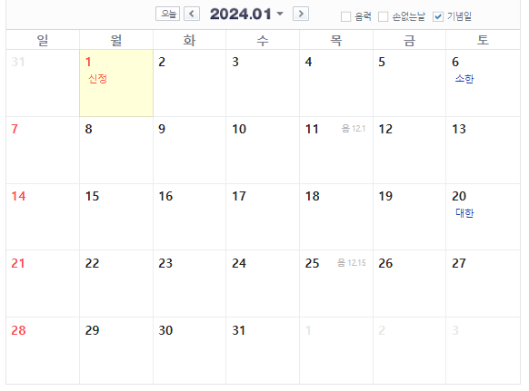 1월은 공휴일이 신정 하루이며, 월요일이라 주말과 함께 3일 연휴가 만들어졌습니다.