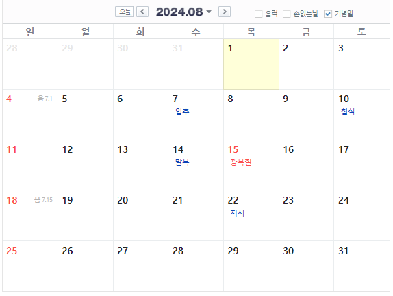 8월에는 공휴일은 우리나라가 일본으로부터 독립한 광복절(15일)이 있습니다.