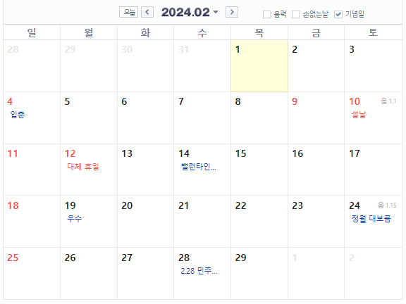 그리고 공휴일은 아니지만 모든 연인들의 사랑을 확인하며, 초콜릿등 다양한 선물을 주고받는 14일 밸런타인과 24일 민속명절 정월대보름이 같이 있네요. 정월대보름에는 꼭 호두나 땅콩등으로 부럼 깨기와 성인들은 귀밝이술을 드셔보시기 바랍니다.