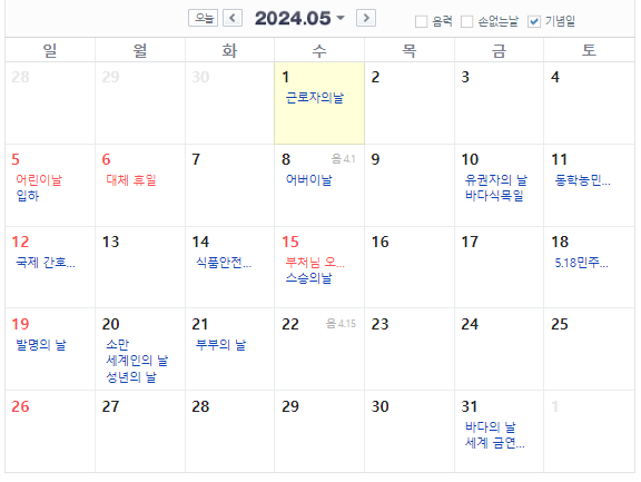 그리고 스승의 날이 공휴일? 바로 부처님 오신 날과 겹 처지면서 공휴일이 되어버렸네요.